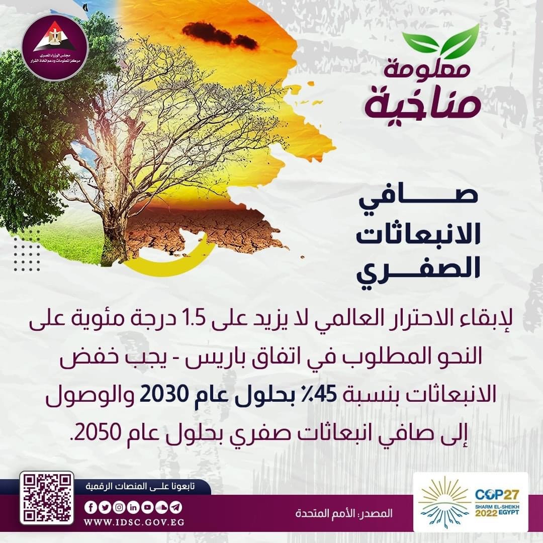 وتابع الانفوجراف ان صافي الانبعاثات الصفري لإبقاء الاحترار العالمي، لا يزيد على 1.5 درجة مئوية على النحو المطلوب في اتفاق باريس يجب خفض الانبعاثات بنسبة 45% بحلول 2030 والوصول الى صافي انبعاثات صفري بحلول 2050.