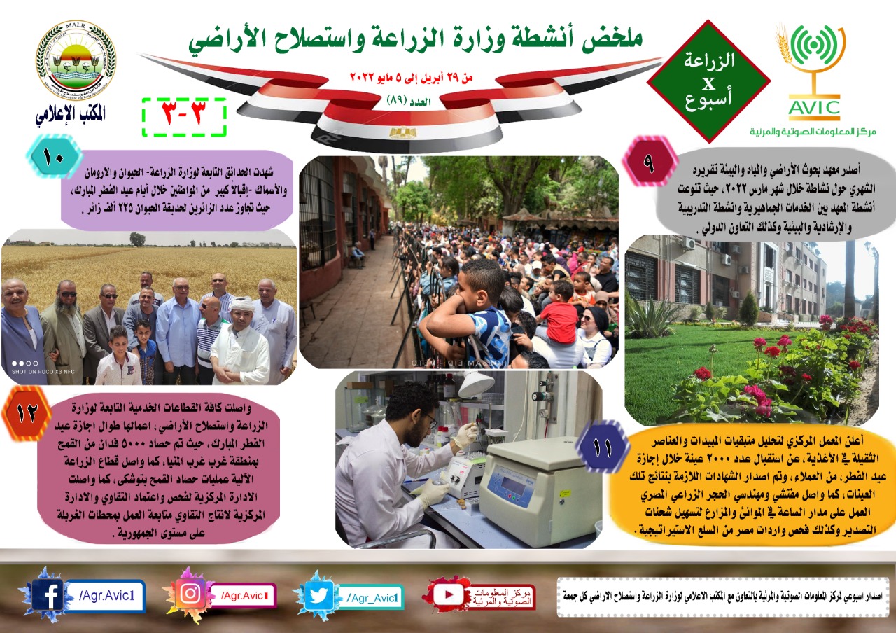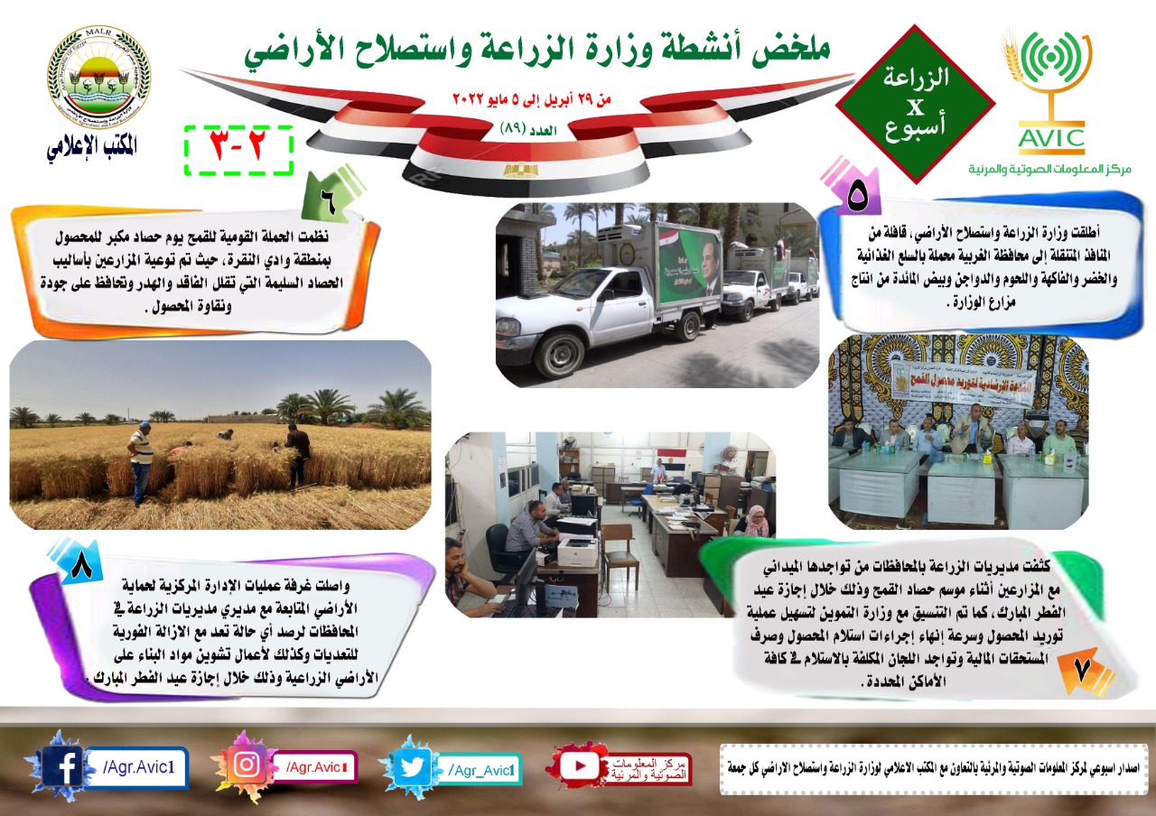 أصدر مركز المعلومات الصوتية والمرئية، التابع لوزارة الزراعة واستصلاح الأراضي، الإنفوجراف الأسبوعي في نسخته رقم 89، حول الحصاد الأسبوعي لأهم أنشطة الوزارة، خلال الأسبوع الماضي في الفترة من 29 إبريل وحتى 5 مايو الجاري.