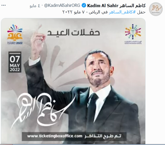 ونشر كاظم الساهر، تفاصيل الحفل عبر حسابه الشخصي بموقع تويتر، وذلك على مسرح أبو بكر سالم في العاصمة السعودية بالرياض، وعلق: حفل كاظم الساهر في الرياض 7 مايو 2022.