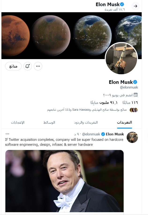 بتصفح الحساب الشخصي لـ إيلون مساك على موقع تويتر اكتشفنا أن إيلون ماسك يتابعه 91.1 مليون شخص وجهة حول العالم، بينما يتابع هو فقط 116 شخصا وجهة.. فمن هم؟