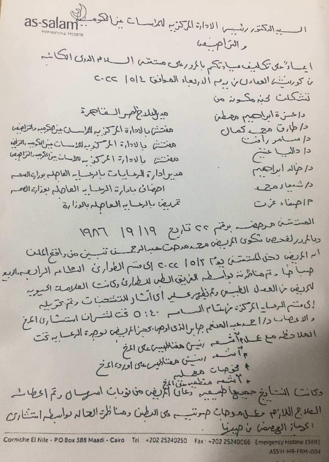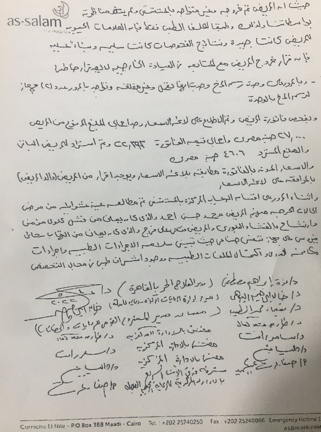 وأفاد تقرير لجنة الصحة عن مستشفى السلام الدولي، أن نتائج الفحوصات جميعها طبيعي، وتبين أن المريض يعاني نوبات إسهال، وتم إعطائه العلاج اللازم، وعمل موجات صوتية على البطن ومناظرة الحالة بواسطة استشاري الجهاز الهضمي.