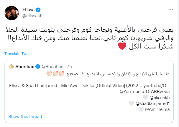 لترد عليها إليسا، قائلةً: يعني فرحتي بالأغنية ونجاحنا كوم وفرحتي بتويت سيدة الحلا والرقي شريهان كوم تاني، نحن تعلمنا منك ومن فنك الإبداع!! شكرًا ست الكل.