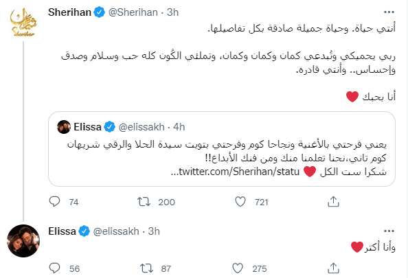 كما عبرت شريهان عن حبها لإليسا، في تويتة أخرى، قائلةً: انتي حياة، وحياة جميلة صادقة بكل تفاصيلها، ربي يحميكي وتبدعي كمان وكمان وكمان، وتملئي الكون كله حب وسلام وصدق وإحساس وانتي قادرة، أنا بحبك.