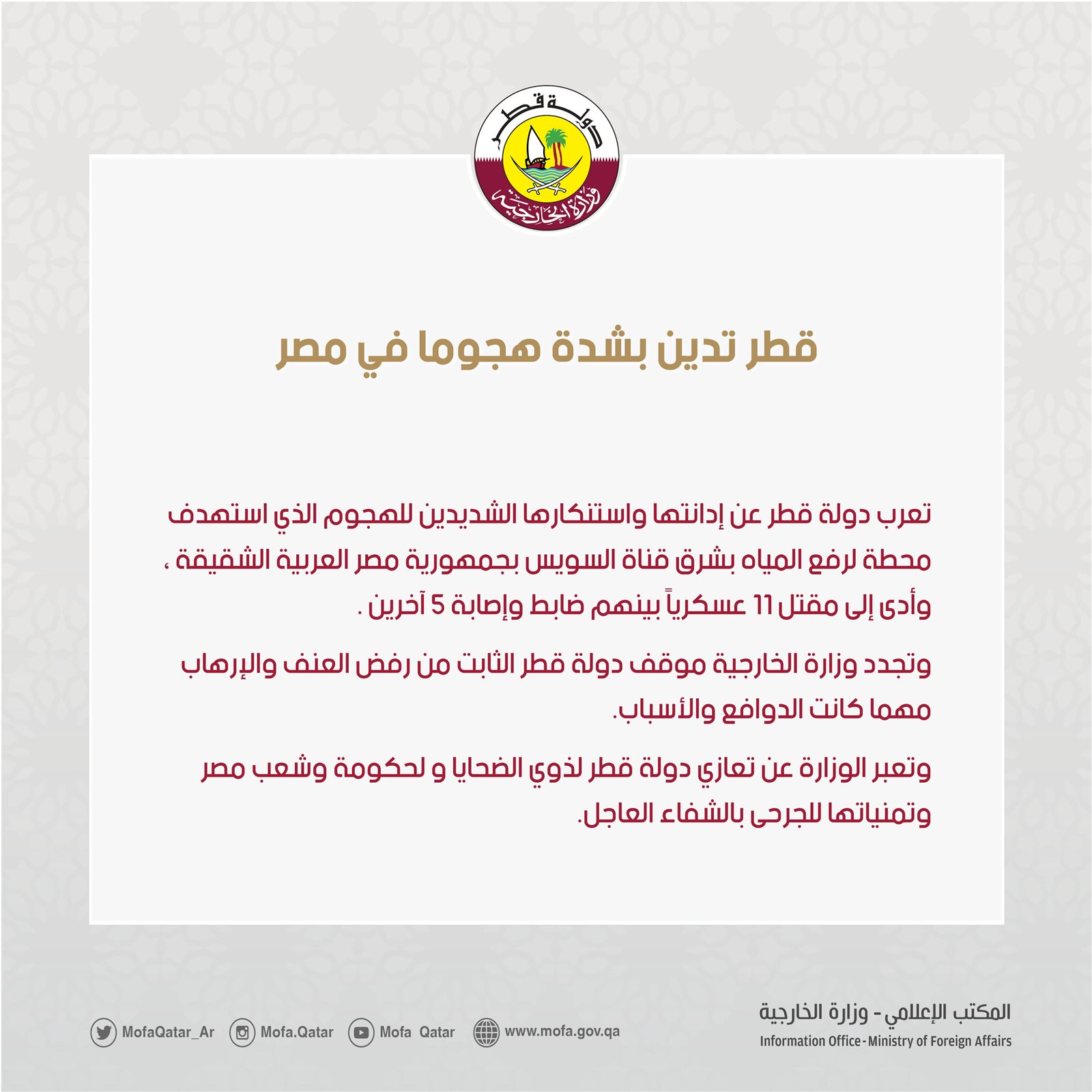 وأدنت دولة قطر الهجوم الإرهابي الذي استهدف محطة لرفع المياه شرق قناة السويس، والذي أسفر عن استشهاد ضابط و10 جنود وإصابة 5 آخرين.
