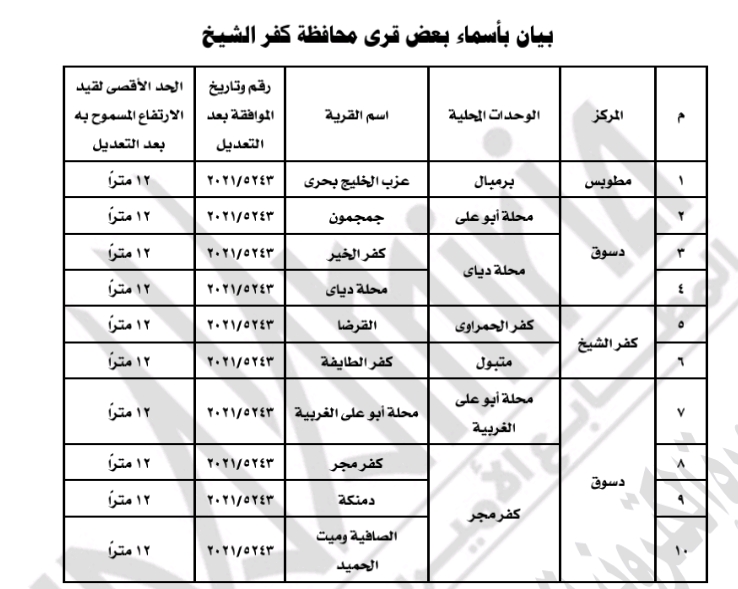 أصدر الدكتور عاصم الجزار وزير الإسكان والمرافق والمجتمعات العمرانية، قرار رقم 258 لسنة 2022، بتعديل قيود الارتفاع بالمخططات الاستراتيجية العامة لعدد 10 قرى من قرى محافظة كفر الشيخ بارتفاعات لا تتخطى الـ 12 مترًا، ووفقًا للضوابط والاشتراطات الواردة بموافقة هيئة عمليات القـوات المسلحة بوزارة الدفاع وذلك على النحو الوارد تفصيلا بالجدول المرفق بهذا القرار.