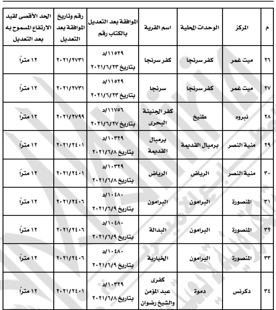 نشرت الجريدة الرسمية في عددها الصادر اليوم 8 مايو لسنة 2022، قرارًا لوزير الإسكان والمجتمعات العمرانية رقم 304، بشأن تعديل قيود الارتفاع بالمخطط الاستراتيجي العام لعدد 34 قرية مـن قرى محافظة الدقهلية بارتفاع 12 مترًا، ووفقا للضوابط والاشتراطات الواردة بموافقة هيئة عمليات القوات المسلحة بوزارة الدفاع وذلك على النحو الوارد تفصيلًا بالجدول المرفق بهذا القرار، علي أن يتم تطبيقه والعمل به من تاريخ 7/4/2022.