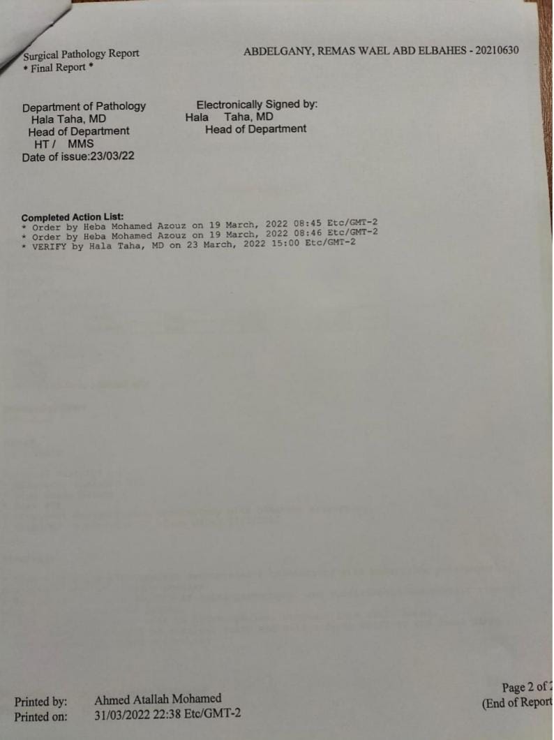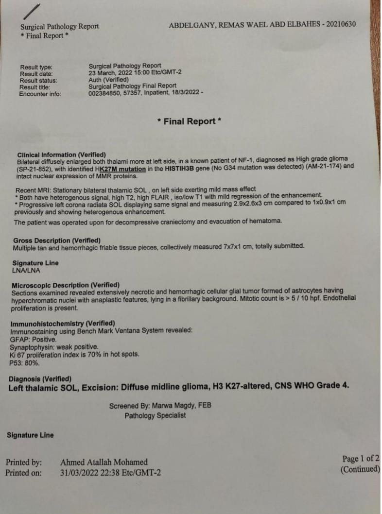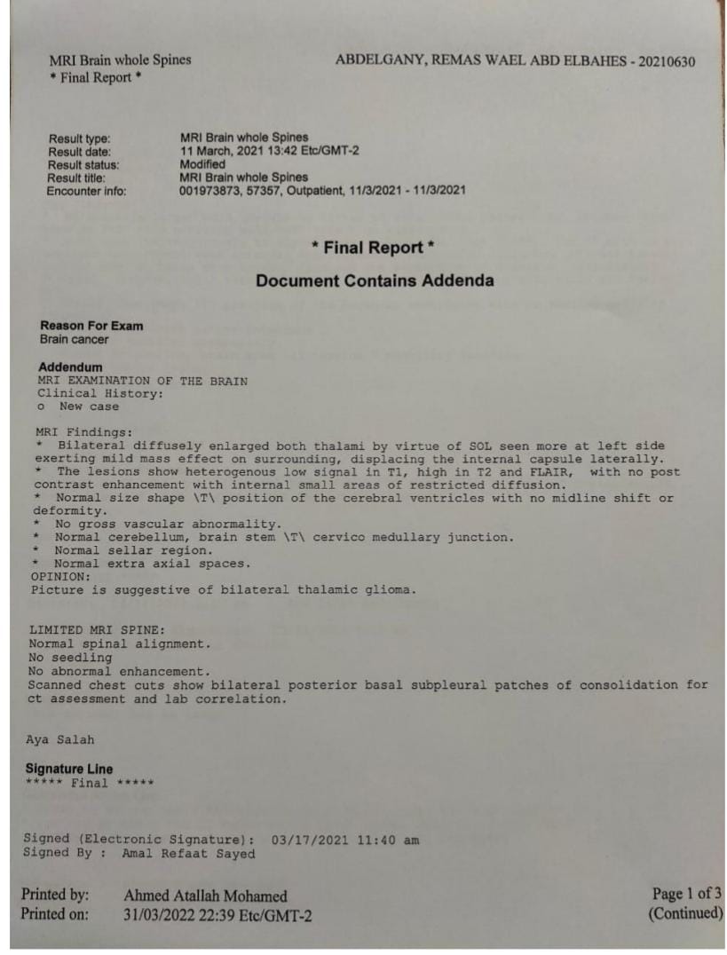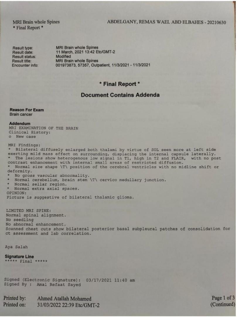 وأضافت الأم في تصريحات خاصة لـ القاهرة 24: ريماس جالها ورم في شهر مارس2021، ودخلت مستشفى للأورام الأطفال في القاهرة، وكانت بتمشي على رجلها وبتروح المدرسة وقتها.