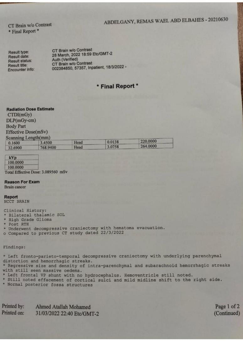 وواصلت والدة الفتاة: بعد شهر لسانها تقل، ودخلت المستشفى تاني، والدكاترة أعطوها أدوية كرتيزون ومسكنات، وفي مارس 2022، تعبت جدًا وروحت بيها على المستشفى.. الدكاترة شافوا ودنها لاقوها بتنزف، قالولنا لازم تدخل عمليات حالًا، وهي ممنوعة من العلميات، لأن الورم في جزع المخ.