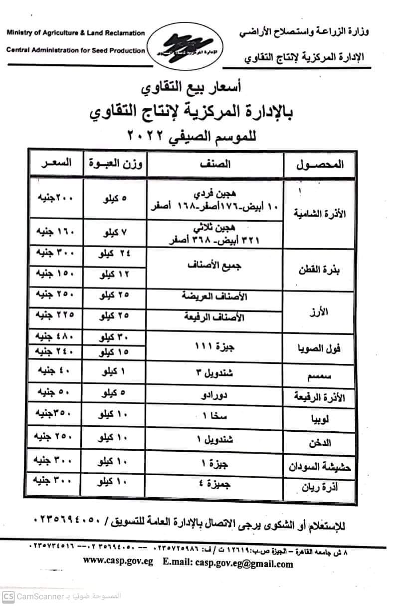 أعلنت وزارة الزراعة واستصلاح الأراضي، أسعار تقاوي محاصيل الموسم الصيفي، المتواجدة بمنافذ الإدارة المركزية لإنتاج التقاوي والجمعيات والإدارات الزراعية.