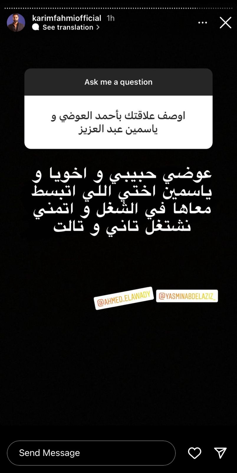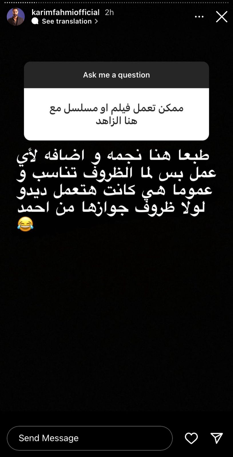 رد الفنان كريم فهمي، على أسئلة واستفسارات الجمهور المختلفة عبر خاصية الـ ASK، حيث كشف عن أعماله الفنية المقبلة بجانب حياته الشخصية.