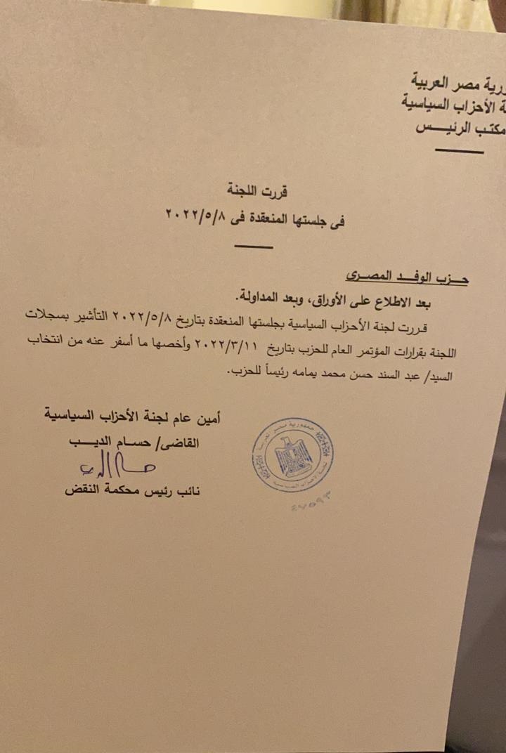 قررت لجنة الأحزاب السياسية في جلستها المنعقدة أمس، التأشير بسجلات اللجنة بقرارات المؤتمر العام للحزب بتاريخ 11 مارس 2022 وأخصها ما أسفرت عنه من انتخابات حزب الوفد للدكتور عبد السند حسن محمد يمامة وشهرته عبد السند يمامة رئيسًا لحزب الوفد.