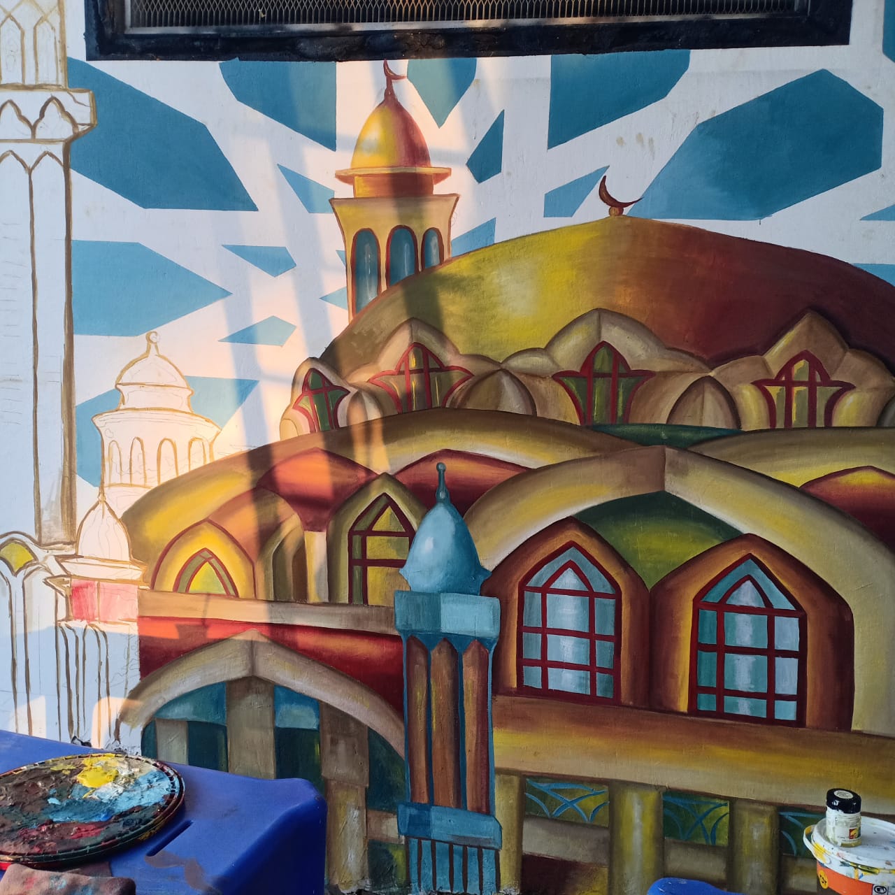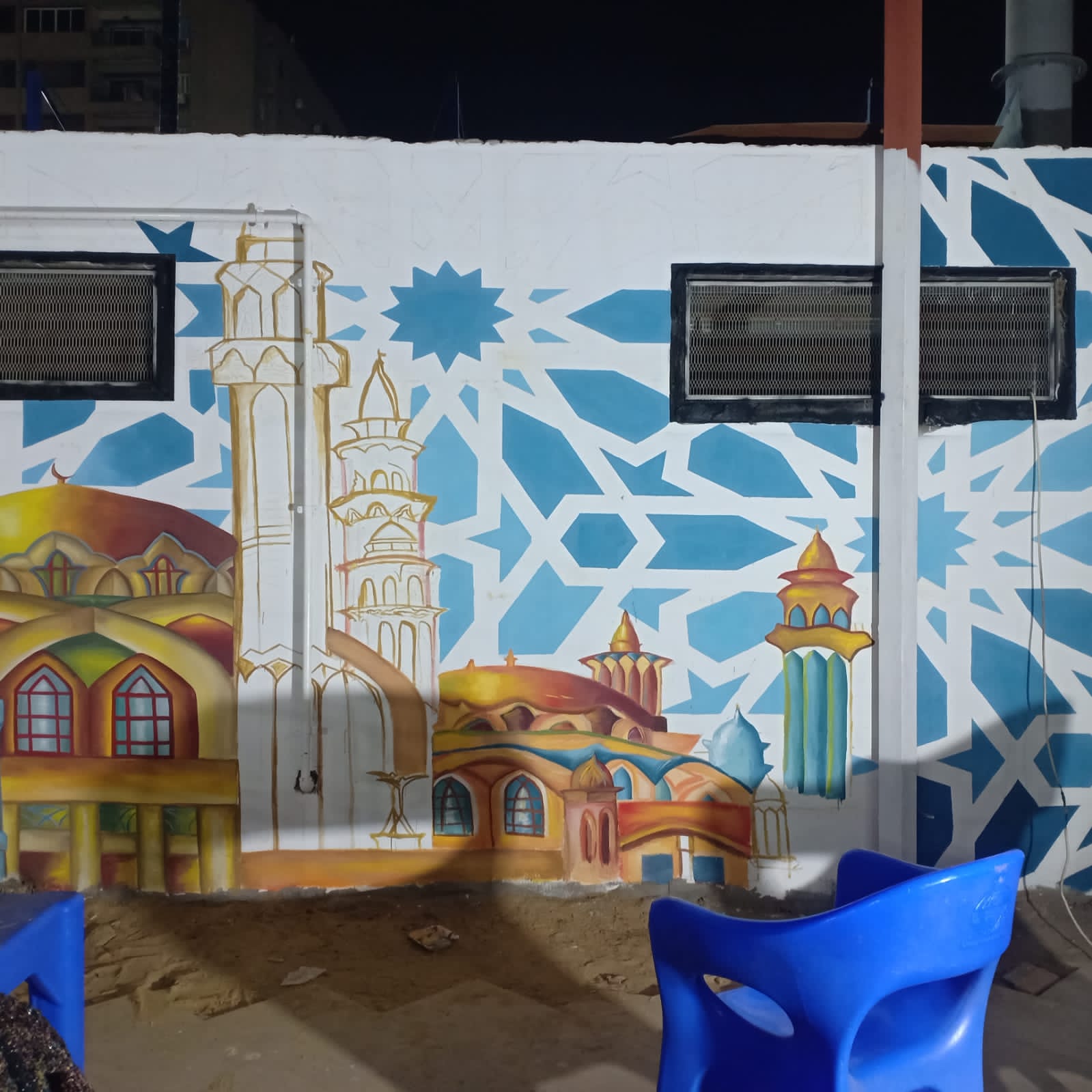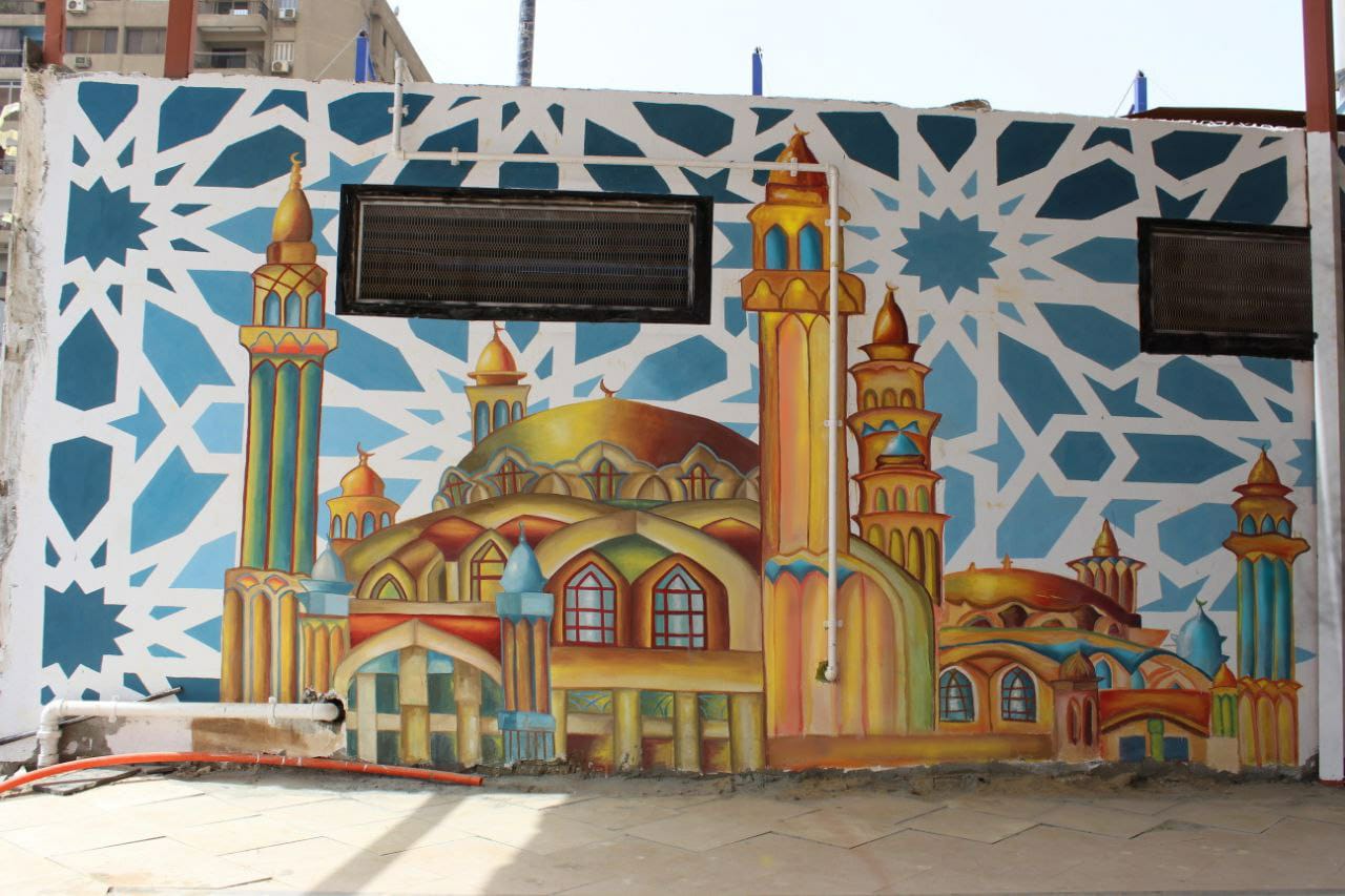 والجدير بالذكر، أنه تم تدريب الطلاب في نادي النصر الرياضي بمصر الجديدة، وبعد فحص جدران النادي وجدوا حائط المسجد قابلة للرسم عليها وخاصة مصلى السيدات، فتم استقرار المجموعة علي التصميم علي حائط مصلي السيدات واخذ الزخارف فقط لكل افاريز الحائط الخارجي للمسجد، واستعملوا الوان الأورا والبلاستيك في التنفيذ.