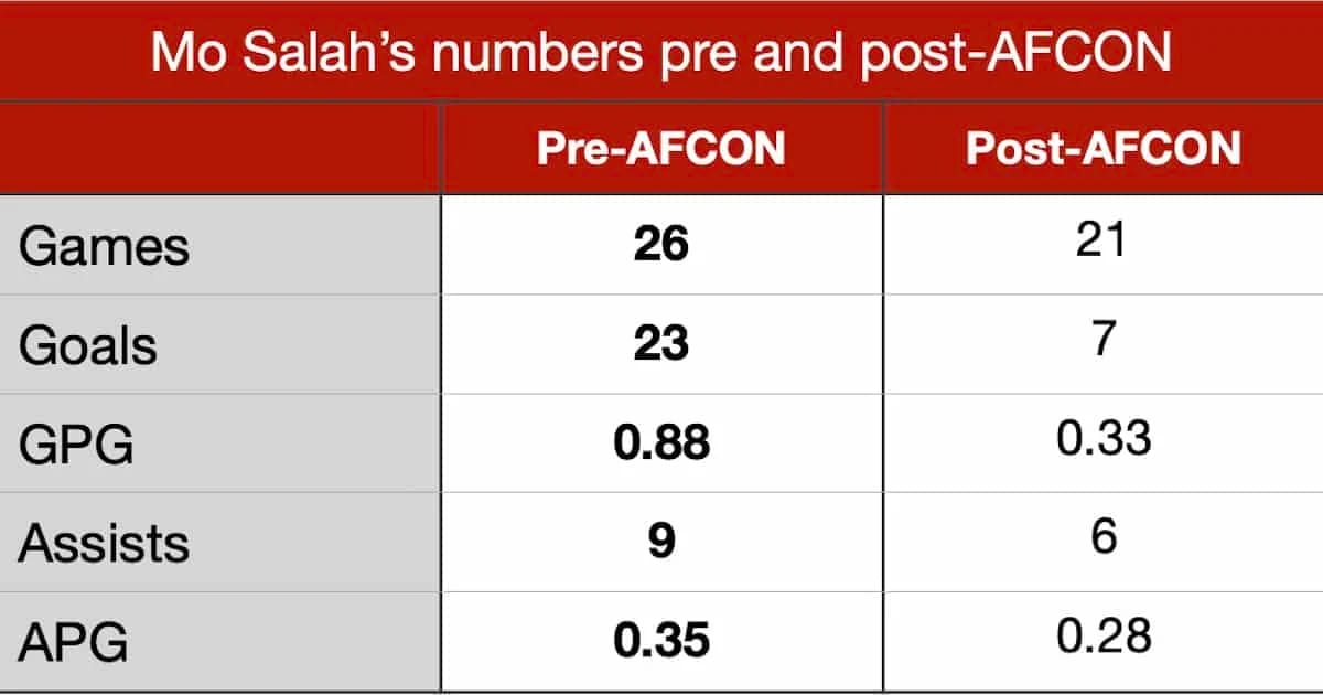 وأشارت إلى أنه بعد مشاركة الدولي المصري في بطولة كأس الأمم الإفريقية؛ فقد لعب مع ليفربول 21 مباراة؛ تمكن من تسجيل 7 أهداف، بالإضافة إلى صناعة 6 أهداف لزملائه.