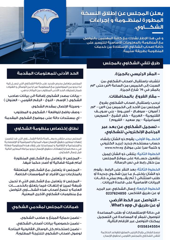 أو زيارة أقرب فرع من فروع المجلس المنتشرة في 11 محافظة، والموضح عناوينها وأماكنها على الخرائط الجغرافية الواردة مع هذا البيان، أو زيارة مقر مكتب الشكاوى في 69 شارع الجيزة أمام المقر القديم لمديرية أمن الجيزة، أو زيارة المقر الرئيسي للمجلس بالتجمع الخامس شارع التسعين الشمالي.