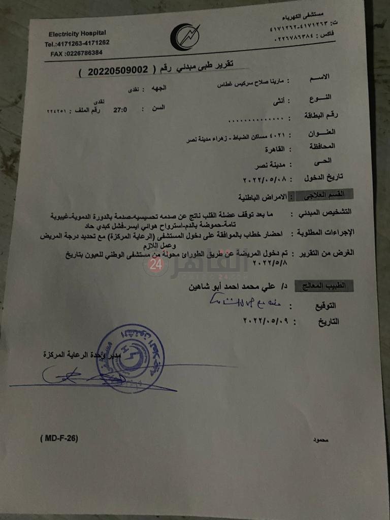 حصل موقع القاهرة 24، على التقرير الطبي الخاص بوفاة مارينا صلاح ضحية مستشفى الوطني للعيون، التي توفت نتيجة خطأ طبي، وتم نقلها إلى قسم الرعاية المركزة بمستشفى الكهرباء.