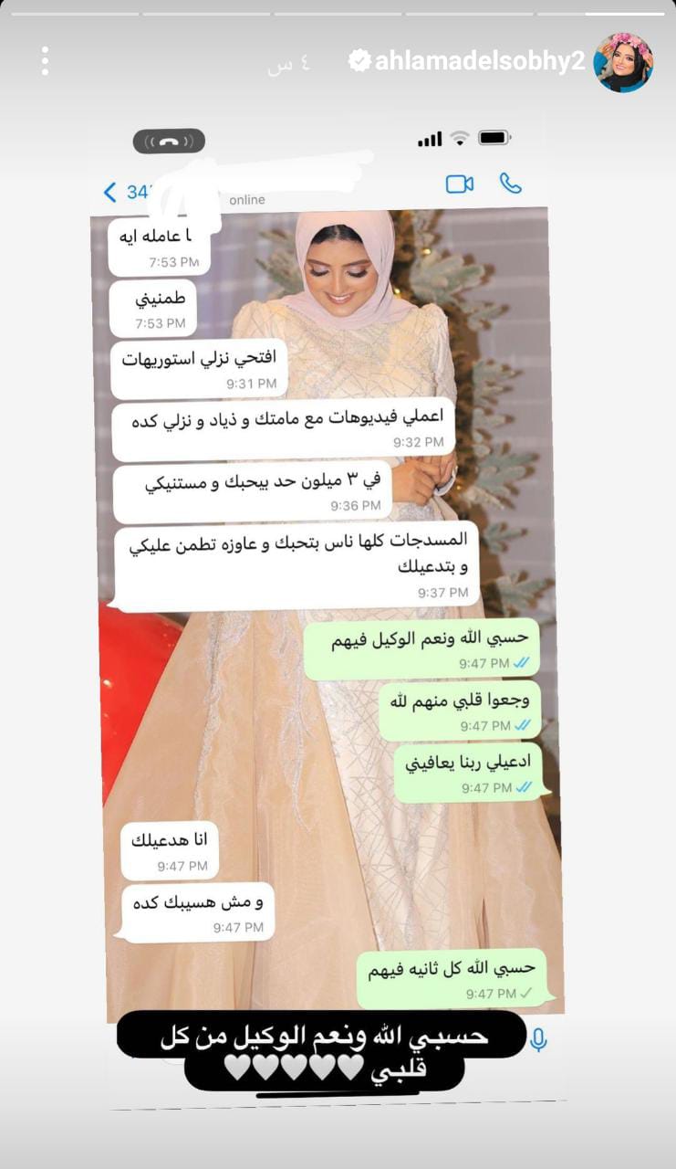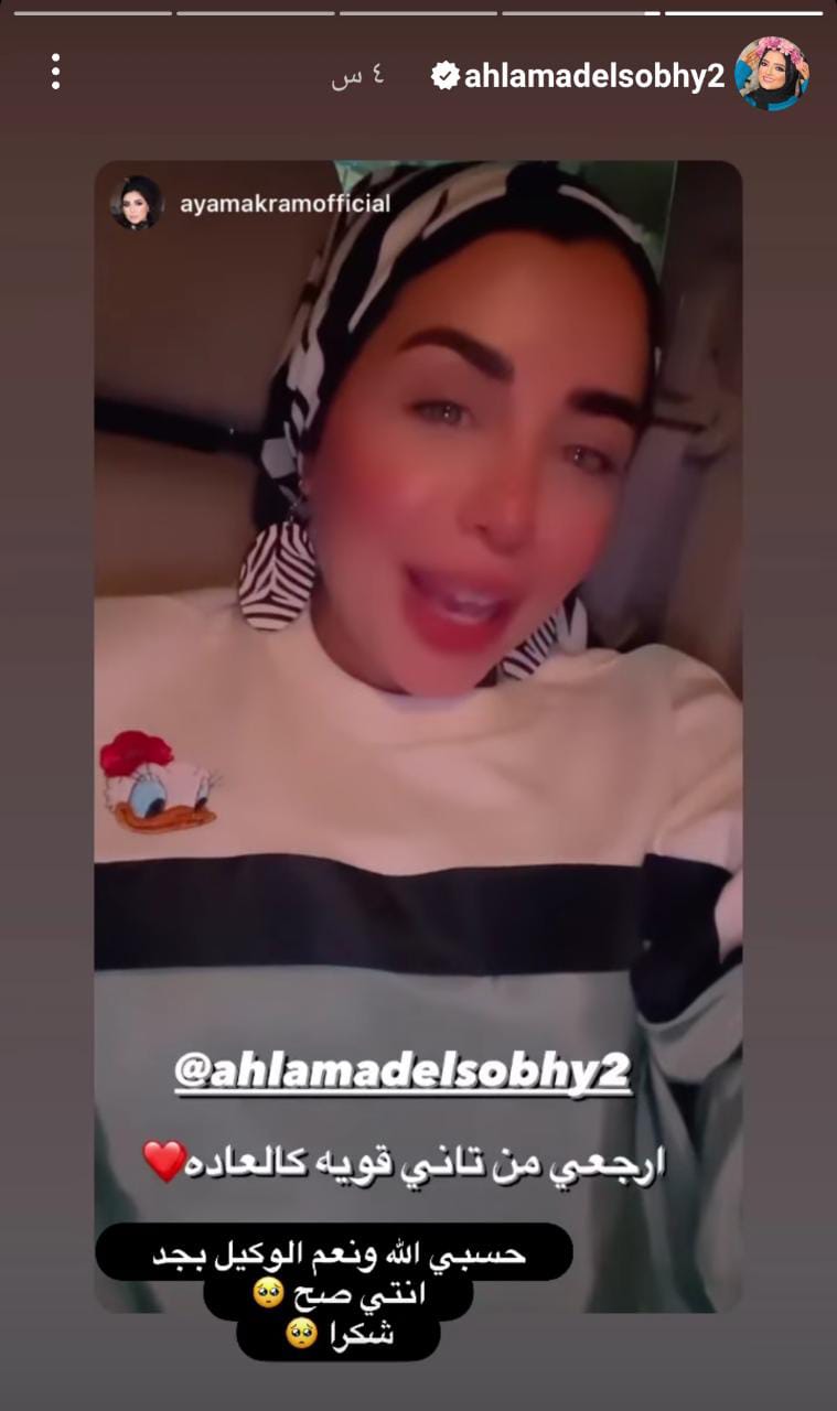 وتابعت أحلام خلال الاستوري: بكرة بإذن الرحمن هنتقابل الساعة 10..ولحد ما بكرة يجي ادعولي ابقي كويسة وربنا يخلصنا منها على خير.