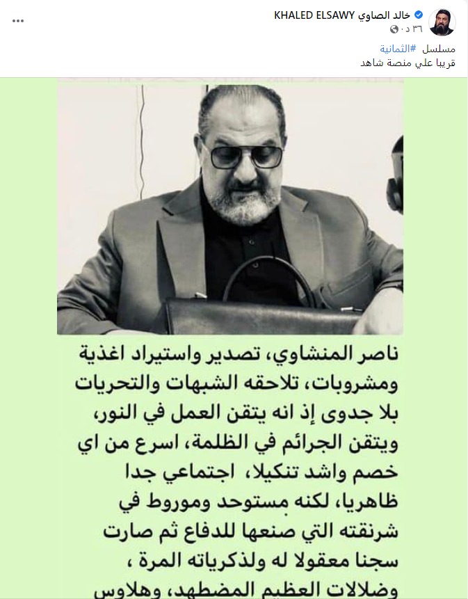 وقال خالد الصاوي منشورًا عبر حسابه الشخصي بموقع التواصل الاجتماعي فيس بوك: ناصر المنشاوي، تصدير واستيراد أغذية ومشروبات، تلاحقه الشبهات والتحريات بلا جدوى إذ أنه يتقن العمل في النور، ويتقن الجرائم في الظلمة.