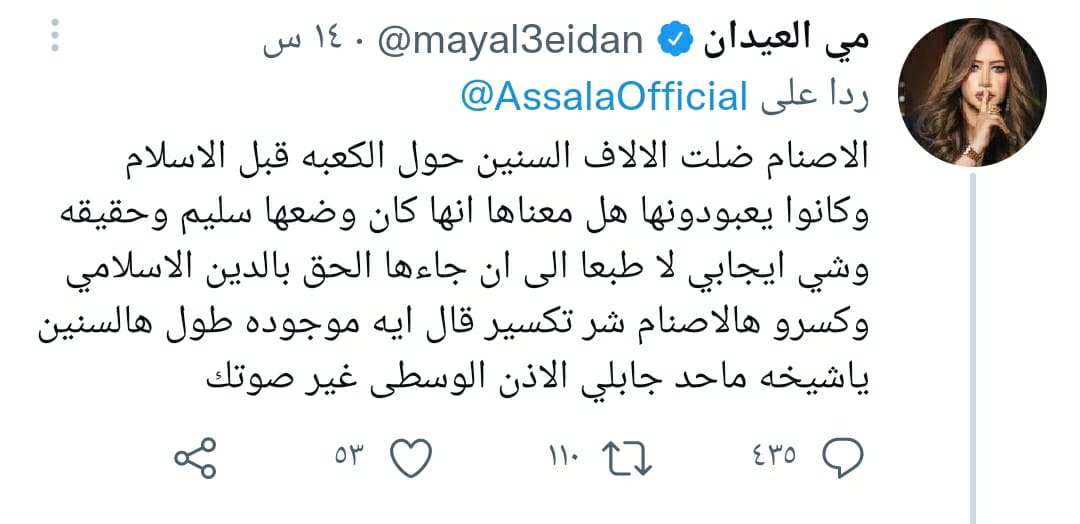 التغريدة استفزت مي العيدان، فردت عليها قائلة: الأصنام ظلت آلاف السنين حول الكعبة قبل الإسلام، وكانوا يعبدونها هل معناها أنها كان وضعها سليم، وحقيقة وشىء إيجابي؟!، لأ طبعًا إلى أن جاءها الحق بالدين الإسلامي، وكسرو هذه الأصنام شر تكسير.. قال إيه موجودة طول السنين، يا شيخة ماحد جابلي الأذن الوسطى غير صوتك.