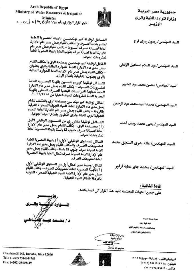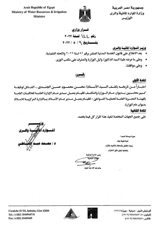 وتابع خطاب الري: "يكلف محسن محمود حسن الجندي، الشاغل لوظيفـة كبير محاسبين بـديوان عام الـوزارة والمكلف للقيـام بعمـل مدير الإدارة العامة للعلاقات العامـة بالهيئة المصرية العامة لحمايـة الشواطئ، للقيــام بعمـل مـديـر عـام الأسلاك بالإدارة المركزيـة للأملاك، بديوان عام الوزارة.