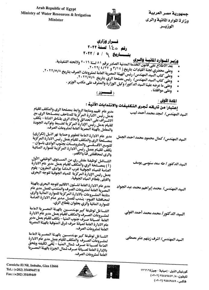 وتابع خطاب الري، أن المهندس کمال محمود محمد احمد الجمل، مدير عام الإدارة العامة لتطوير وحماية نهر النيل بمصلحة الري، والمكلف للقيام بعمل رئيس الإدارة المركزية للتوسع الأفقي والمشروعات بجنوب الوادي بأسوان، يكلف للقيام بعمل رئيس الإدارة المركزية للموارد المائية والري لمحافظتي قنا والأقصر.