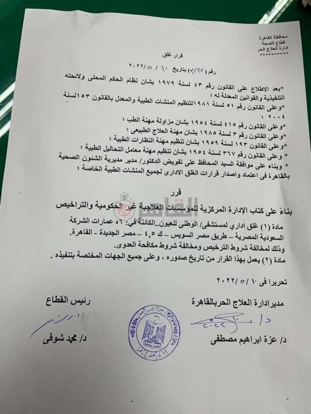 وأفاد القرار الذي حصل القاهرة 24 على نسخة منه، أنه تم غلق فرع مستشفى الوطني للعيون الكائن في منطقة مصر الجديدة بالقاهرة، نتيجة مخالفتها شروط الترخيص ومخالفتها شروط مكافحة العدوى.