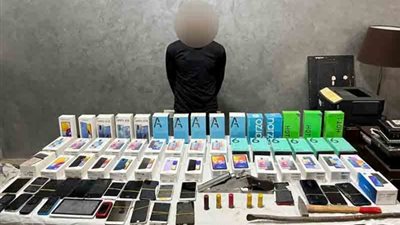 وعقب تقنين الإجراءات أمكن ضبطه وبحوزته 46 هاتف محمول جديد مختلف الأنواع، و25 هاتف محمول مستعمل، وأجنة حديدية وشاكوش وسلاح ناري فرد محلي، وعدد من الطلقات النارية، وبمواجهته اعترف بارتكاب الواقعة.