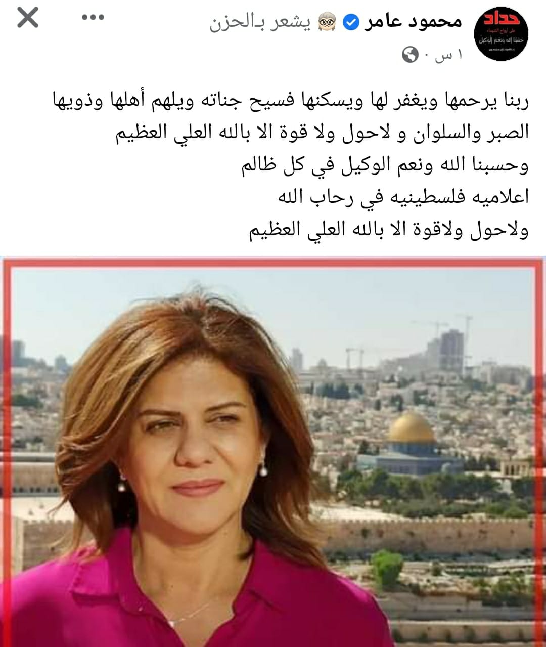 ورثى الفنان محمود عامر الراحلة، عبر حسابه الشخصي بموقع فيس بوك، قائلًا: ربنا يرحمها ويغفر لها ويكنها فسيح جناته، ويلهم أهلها وذويها الصبر والسلوان، ولا حول ولا قوة إلا بالله العلي العظيم، وحسبنا الله ونعم الوكيل في كل ظالم، إعلامية فلسطينية في رحاب الله.