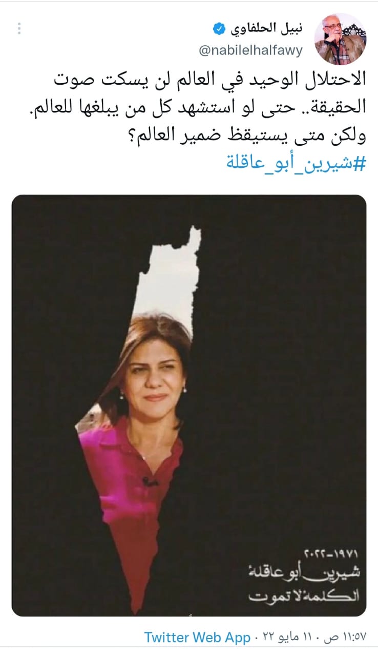 وكتب نبيل الحلفاوي تغريدة قال فيها: الاحتلال الوحيد في العالم لن يسكت صوت الحقيقة، حتى لو استشهد كل من يبلغها للعالم، ولكن متي يستيقظ ضمير العالم؟.
