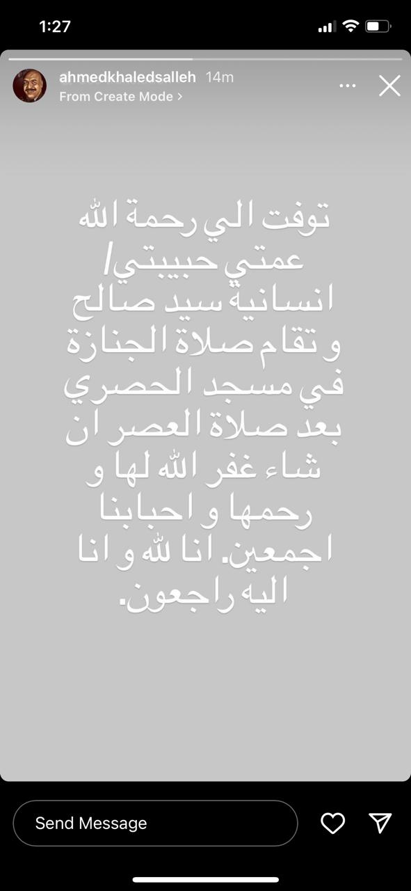 وكتب أحمد خالد صالح عبر خاصية ستوري لحسابه على انستجرام، الآتي: توفت الى رحمة الله عمتي حبيبتي إنسانية سيد صالح وتقام صلاة الجنازة في مسجد الحصري بعد صلاة العصر، إن شاء غفر الله لها ورحمها وأحبابنا أجمعين. إنا لله وإنا اليه راجعون.