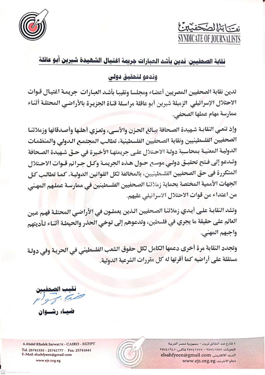 أدانت نقابة الصحفيين المصريين برئاسة ضياء رشوان، بأشد العبارات جريمة اغتيال قوات الاحتلال الإسرائيلي للصحفية شيرين أبو عاقلة مراسلة قناة الجزيرة بالأراضي المحتلة، أثناء ممارسة مهام عملها الصحفي.