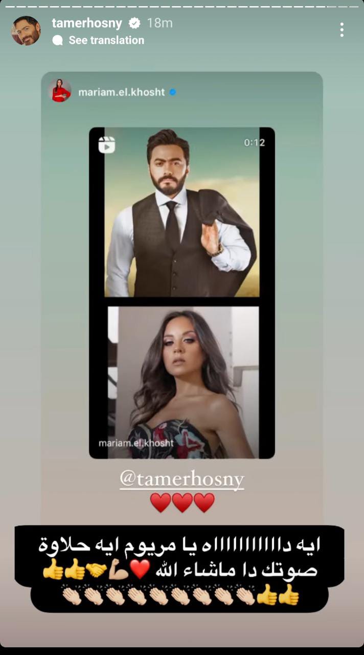 وفي سياق متصل، نشرت مريم الخشت عبر حسابها الشخصي بـ إنستجرام فيديو لها وهي تغني أغنية كفاياك أعذار لـ تامر حسني وكتبت: لو عايز أغنية تامرحسني كفاياك أعذار بصوت مريم الخشت شوف الريل ده.