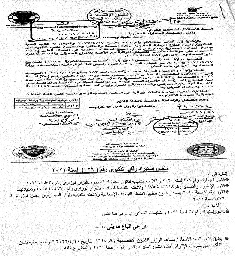 ووفق مستند حصل القاهرة 24 على نسخة منه، أرسله إبراهيم السجيني مساعد وزيرة التجارة والصناعة للشئون الاقتصادية إلى الشحات غتوري، رئيس مصلحة الجمارك، فإنه يجب التنبيه على جميع المواقع الجمركية والموانئ بعدم إدخال أي من هذه المنتجات إلا بموافقة مكتب وزارة الصحة.
