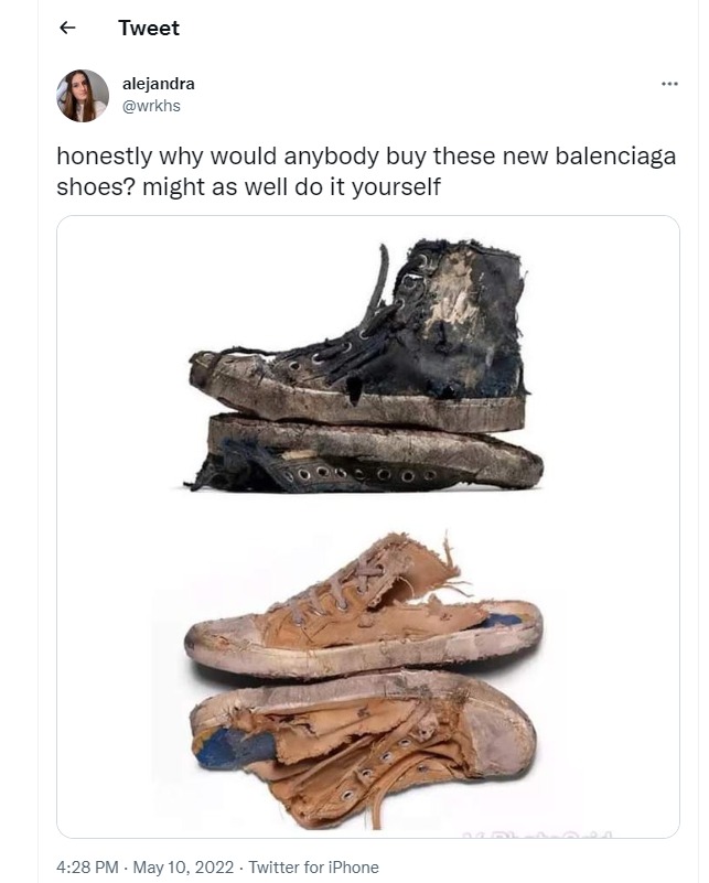 وعلى الرغم من ذلك، فإن الأمر الأكثر إثارة للسخرية هو الثمن المرتبط به، حيث أثارت الأحذية اشمئزاز وسخرية مستخدمي السوشيال ميديا، وتباينت الآراء عبر تويتر وعلق أحدهم: إن الأحذية الرياضية الفاخرة المدمرة تبدو وكأنها تم التنقيب عنها من موقع قديم أو من مكب نفايات.