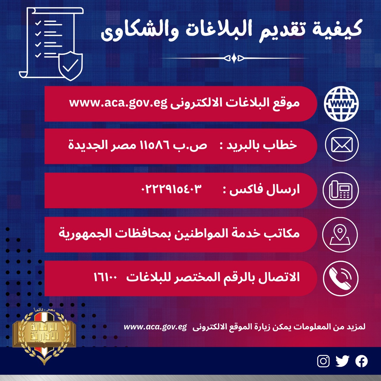 وأكدت الرقابة الإدارية، أنه يتم تقديم البلاغات من خلال الموقع الإلكتروني WWW.aca.gov.eg أو عن طريق خطاب البريد على ص. ب 11586 مصر الجديدة، وأيضًا فاكس على رقم 0222915403.