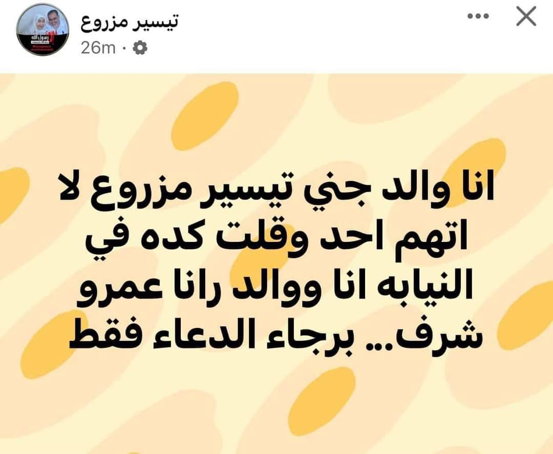 وكتب تيسير مزروع، والد المتوفاة جنى، على صفحته الشخصية بفيسبوك: أنا والد جنى تيسير مزروع ولا أتهم أحدا، وقلت كده في النيابة، ووالد رنا عمر شرف برجاء الدعاء فقط.