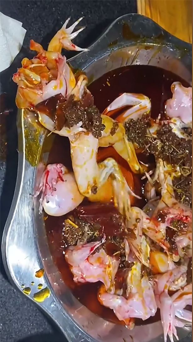 في مقطع فيديو انتشر على مواقع التواصل الاجتماعي، شوهد أحد الضفدع مقطوع الرأس يرتعش ويحرك ساقه عدة مرات، حتى خرج في النهاية من الوعاء إلى الطاولة.