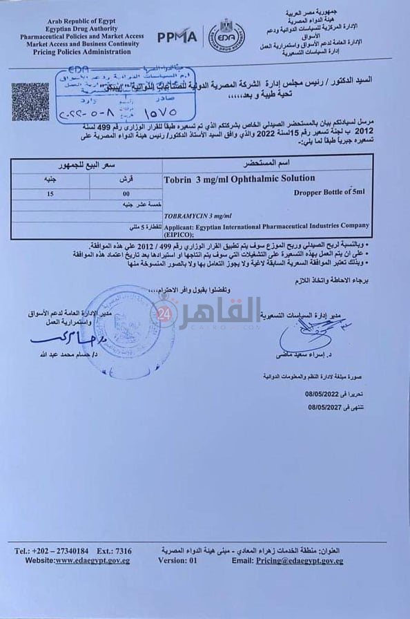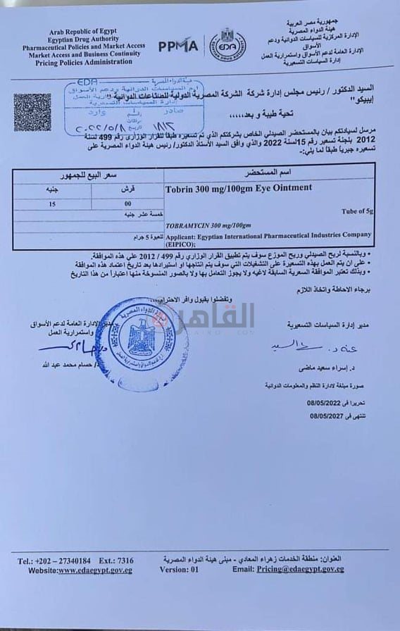 وافقت هيئة الدواء المصرية، ممثلة في إدارة السياسات التسعيرية، على زيادة سعر المستحضر الدوائي توبرين، وهو عبارة عن مضاد حيوي للعيون، إنتاج الشركة المصرية الدولية للصناعات الدوائية “ايبيكو”، وذلك في انعقاد لجنة التسعير الأسبوعية.
