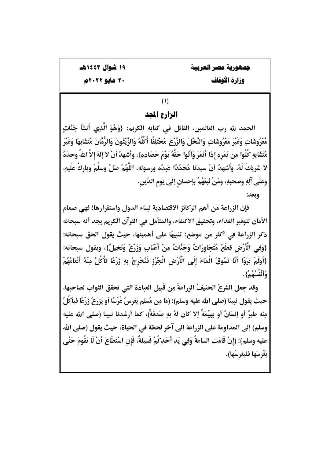 نشرت وزارة الأوقاف نص موضوع خطبة الجمعة القادمة، 19 شوال 1443هـ، الموافق 20 مايو 2022م، تحت عنوان الزارع المجد.