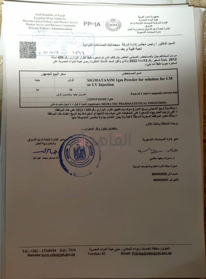 وزيادة سعر مستحضر سيجماتاكسيم حقن من 16.50 جنيه إلى 20.50 جنيه، بما يعادل زيادة بنسبة 19.5%، وهو عبارة عن مضاد حيوي، يستخدم في عدوى الجهاز الهضمي: النزلات المعوية البكتيرية، عدوى البطن البكتيرية، التهاب الغشاء البريتونى، علاج وقائي في العناية المركزة وبعد العمليات الجراحية، ولاسيما الولادة القيصرية، عدوى الجهاز التنفسي السفلي: الالتهاب الرئوي، التهاب الشعب الهوائية، التهاب لسان المزمار البكتيري، عدوى الجهاز البولي التناسلي كالتهاب الكلية وحوضها والتهاب عنق الرحم.