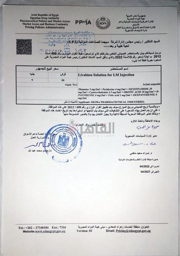 وزيادة سعر مستحضر ليفابيون 6 أمبولات من 42.75 جنيه إلى 54 جنيه، بنسبة تعادل 20.8%، وهو عبارة عن مجموعة فيتامين بي 12، ويستخدم في علاج التهاب الأعصاب وخاصة لدى مرضى السكر وحالات الأنيميا المختلفة وآلام المفاصل.