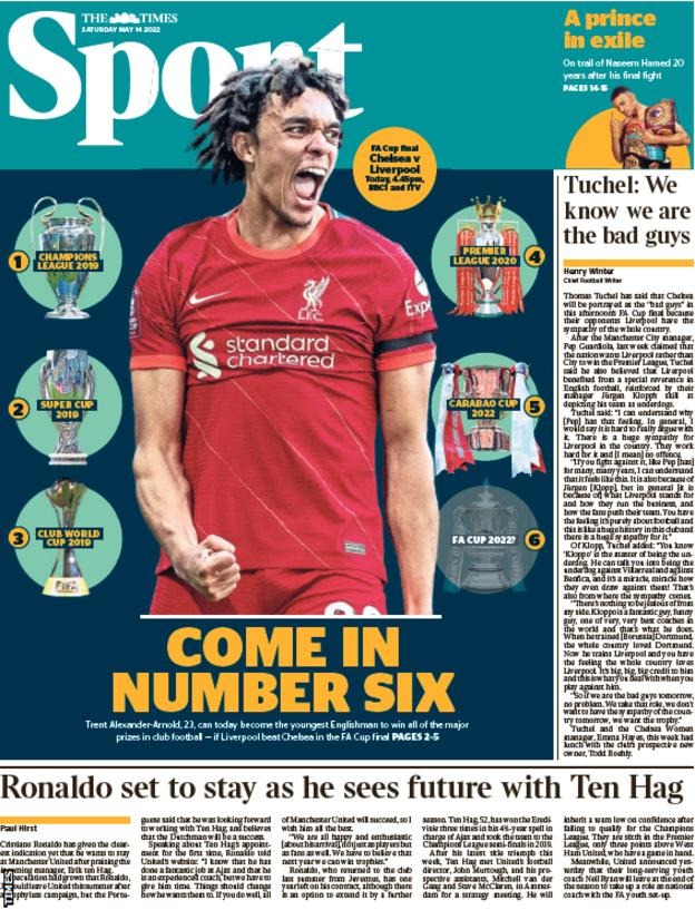 تصدر النجم الإنجليزي ترينت ألكسندر أرنولد غلاف صحيفة تايمز لعدد اليوم، حيث عنونت بـ احصد اللقب السادس، ورصدت الصحيفة في غلافها ألقاب نجم ليفربول الخمسة مع انتظاره للقب السادس.