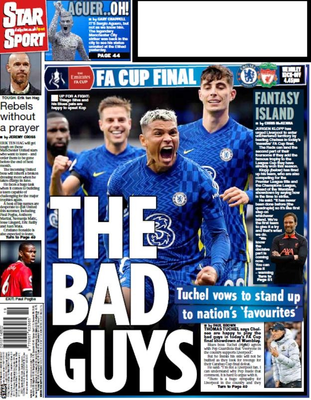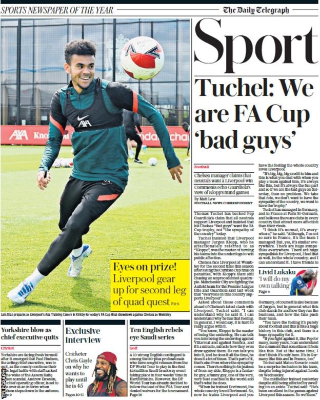 تصدر العنوان العيون على اللقب، غلاف صحيفة تيليجراف لعدد اليوم، حيث أشارت إلى أن مواجهة ليفربول وتشيلسي الليلة ستكون نارية مع أهمية اللقب بالنسبة للطرفين.