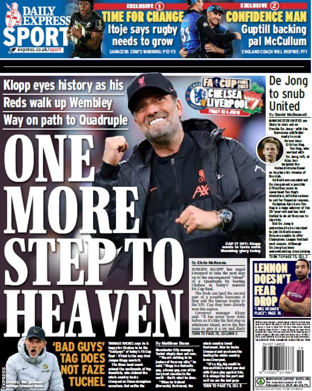 عنونت إكسبريس في غلافها اليوم بـ خطوة ليفربول نحو المجد، حيث أشارت حسب تصريحات يورجن كلوب إلى أن الريدز يتبقى له خطوة أخرى على صنع المجد بالفوز بالثنائية المحلية مع اشتعال صراع الدوري.