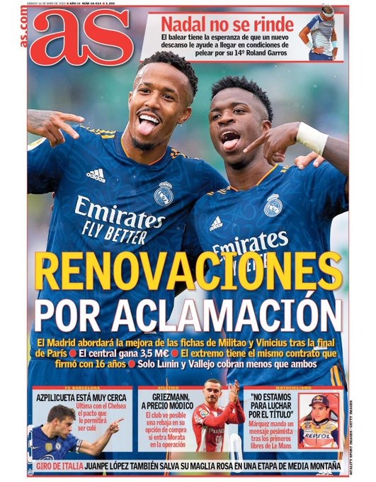 تصدر الثنائي البرازيلي إيدير ميليتاو مدافع ريال مدريد وصديقه فينيسيوس جونيور غلاف صحيفة آس لعدد اليوم، وذلك تحت عنوان "التجديد بعد الإشادة"، حيث قالت أنه سيتم حسم تجديد عقد الثنائي برواتب مميزة.