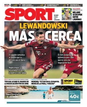 تصدر البولندي روبرت ليفاندوفسكي غلاف الصحيفة لعدد اليوم، وذلك تحت عنوان ليفاندوفسكي يبلغ بايرن ميونخ برغبته في الانتقال إلى برشلونة.
