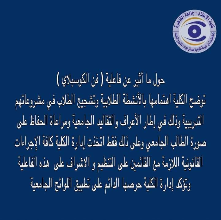 قالت كلية الإعلام بجامعة القاهرة، إن إدارة الكلية اتخذت كافة الإجراءات القانونية اللازمة مع القائمين على التنظيم والإشراف على هذه الفاعلية.