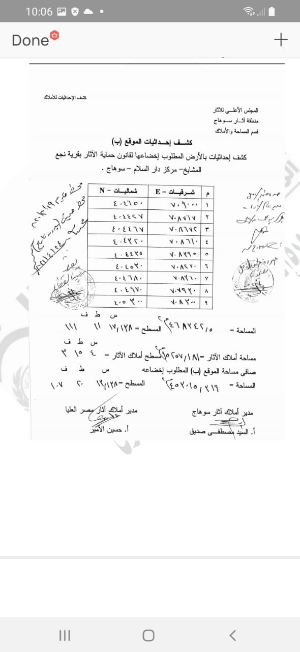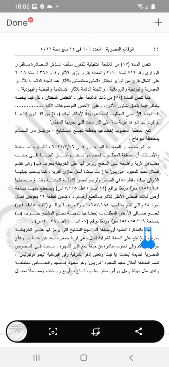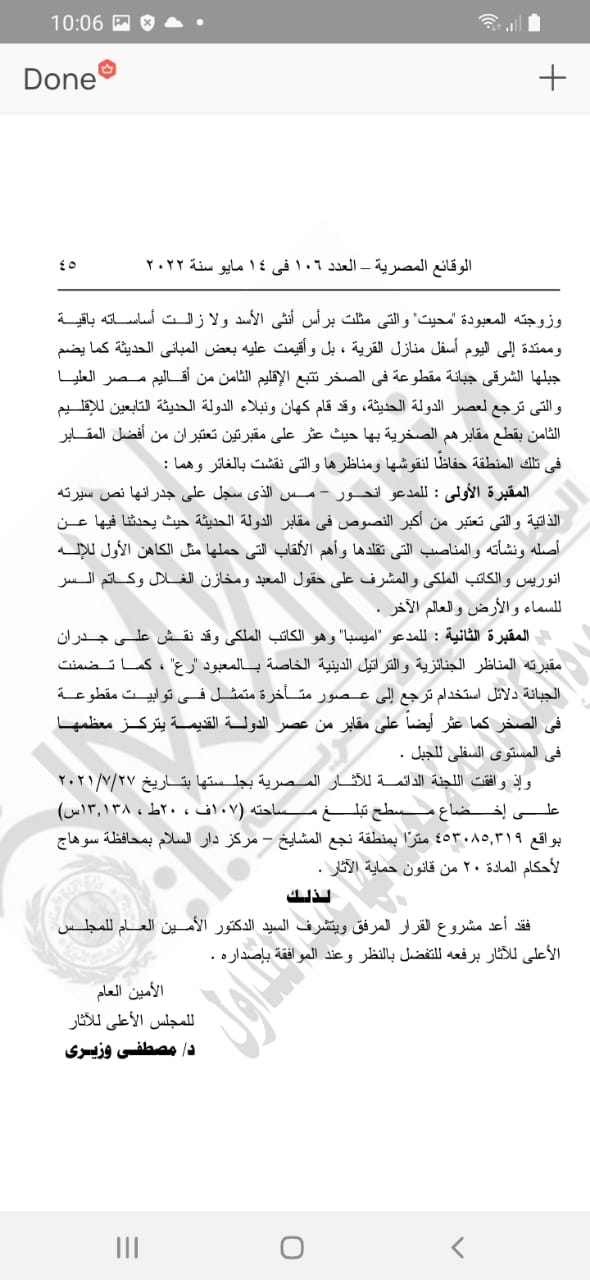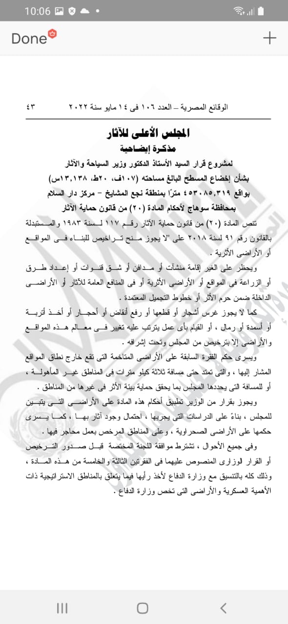نشرت الجريدة الرسمية، قرار وزارة السياحة والآثار، قرار رقم 34 لسنة 2022، الصادر بتاريخ 14 / 2 / 2022، بشأن إخضاع المسطح البالغ مساحته (107، 20 ط،13.138س)، الكائن بمنطقة نجع المشايخ، مركز دار السلام بمحافظة سوهاج، والموضح الحدود والمعالم بالمذكرة الإيضاحية والخريطة المساحية وكشف الإحداثيات المرفقين، لأحكام المادة 20 من قانون حماية الآثار رقم 117 لسنة 1983.