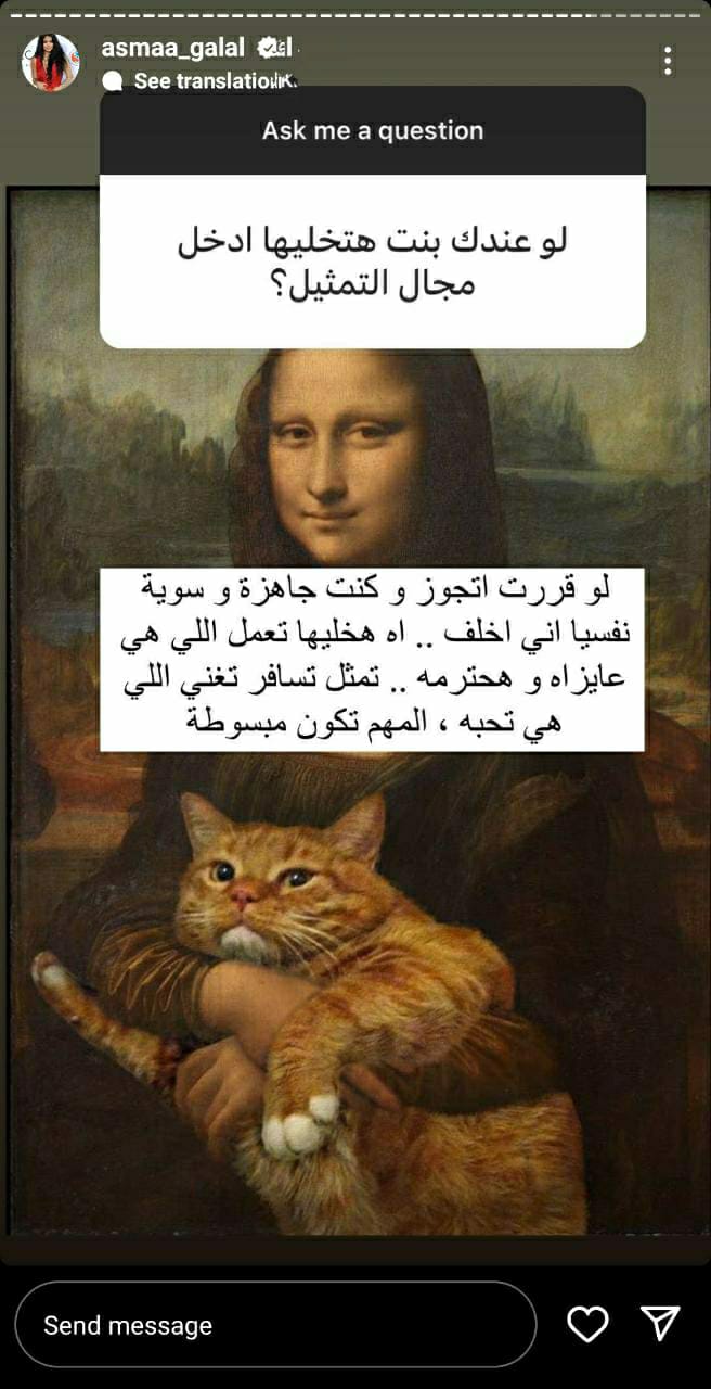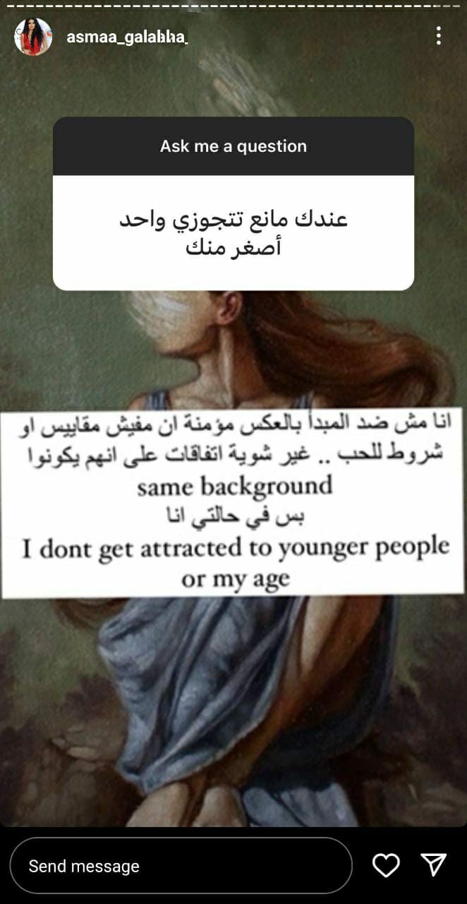 وكانت أسماء جلال تلقت عدة أسئلة من متابعيها، عبر حسابها الشخصي بـ انستجرام، منها: عندك مانع تتجوزي واحد أصغر منك؟؛ لترد عليه قائلة: أنا مش ضد المبدأ بالعكس مؤمنة أن مفيش مقاييس أو شروط للحب، غير شوية اتفاقات على أنهم يكونوا نفس معرفتي، بس في حالتي أنا لا أنجذب إلى شبابي أو عمري.