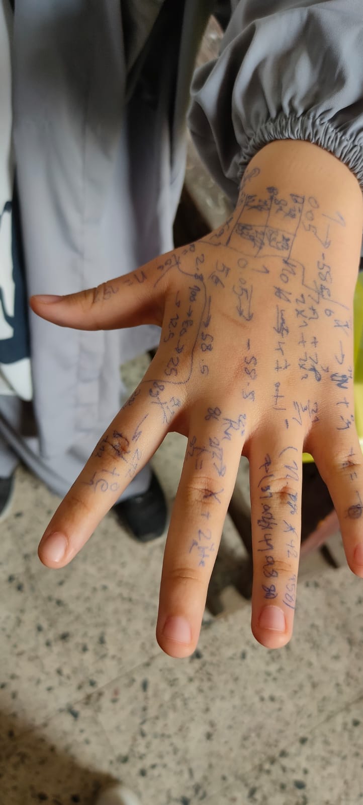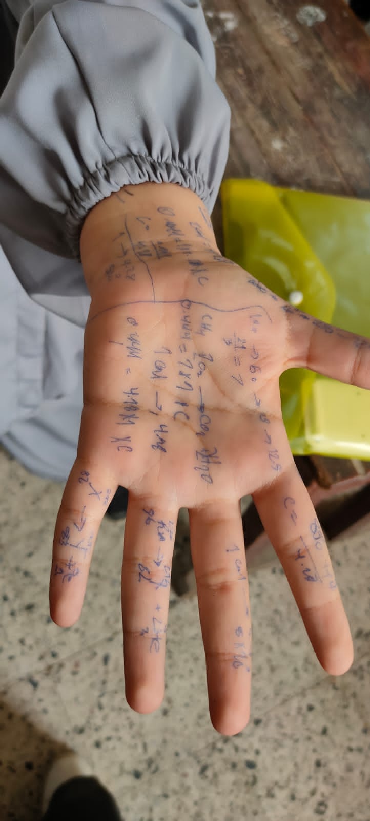 استغاثت هند أحمد، طالبة بـالصف الأول الثانوي، من عدم إتاحة ورقة بيضاء لاستخدامها كمسودات في إجابة الامتحانات العملية مثل الفيزياء والكيمياء والرياضيات مما دفعها للكتابة على يديها.
