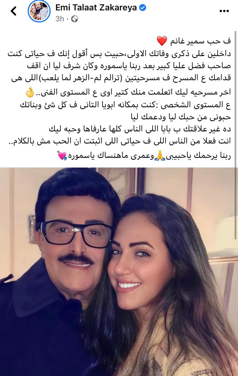 كنت بمكانة والدي ولن أنساك.. إيمي طلعت زكريا تحيي الذكرى الأولى لوفاة سمير غانم